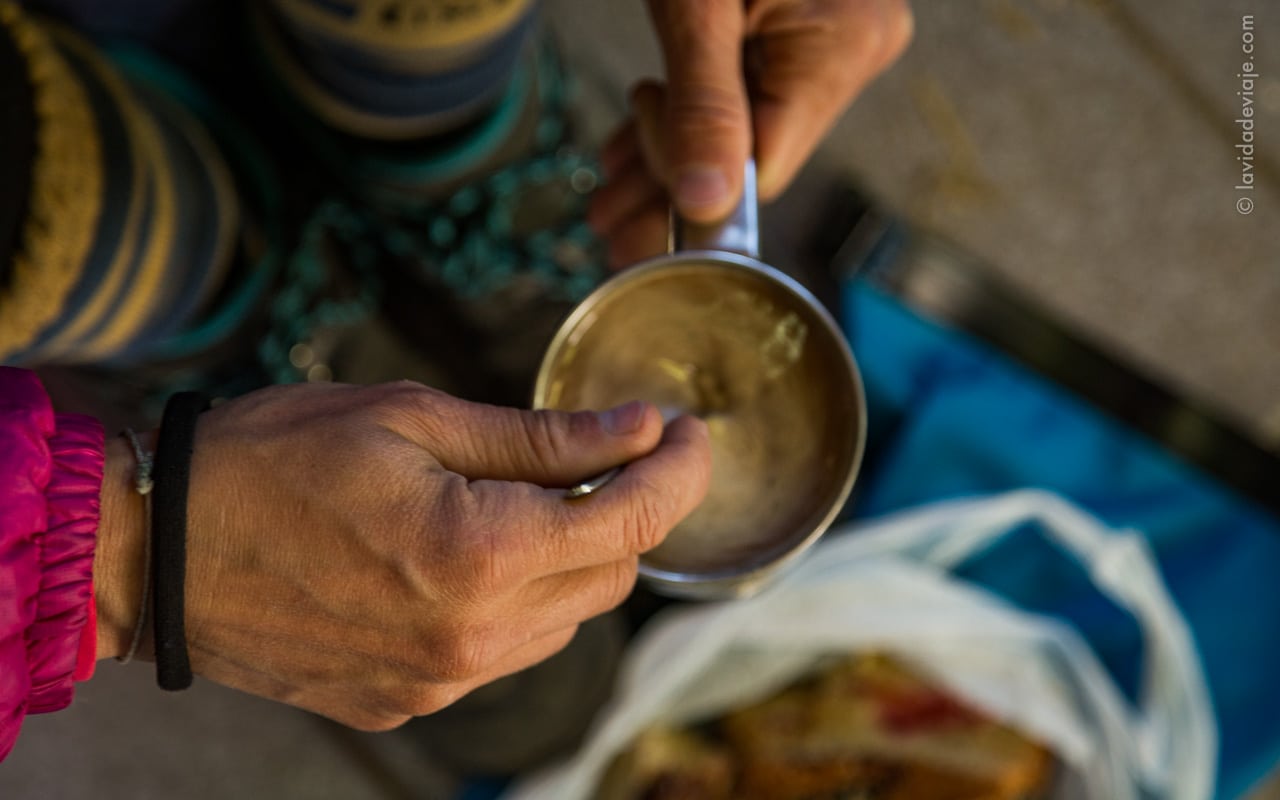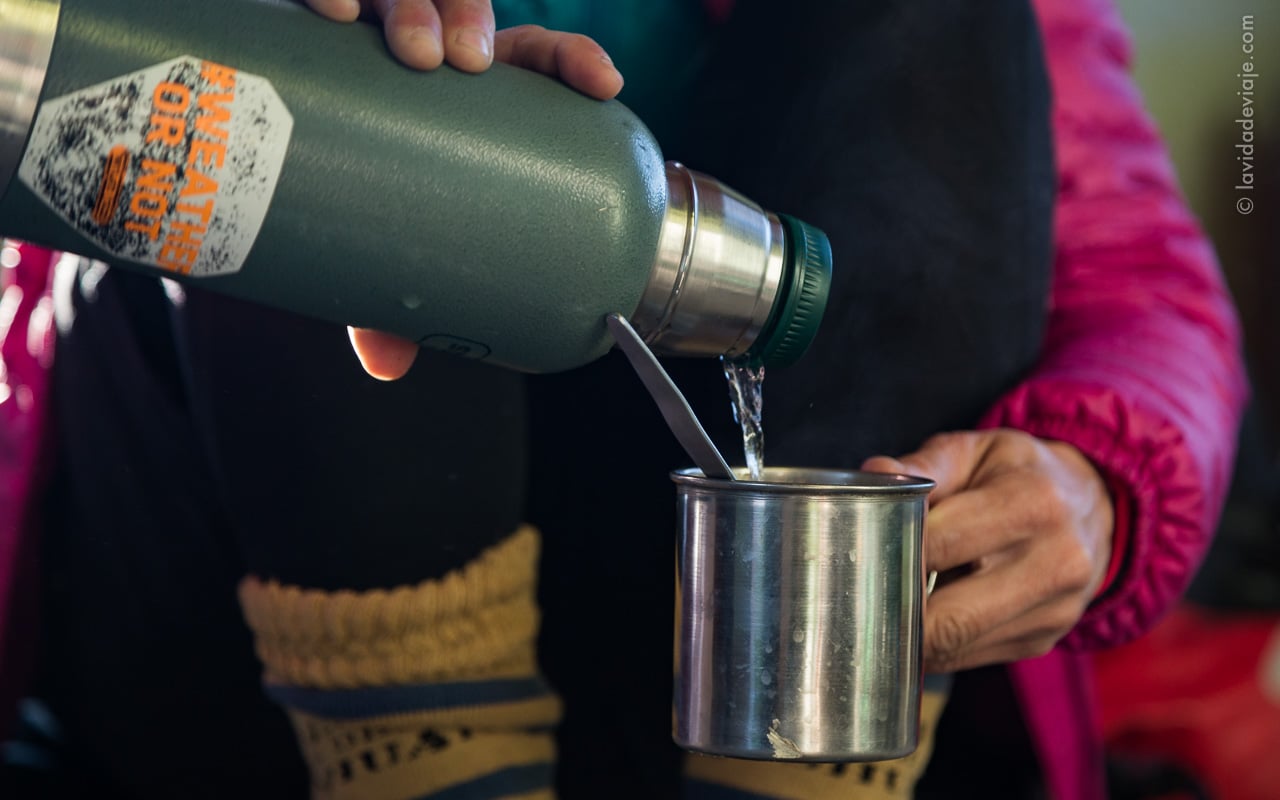 Un mate siempre es un mate. No tenemos el nuestro, ese grande y lindo de madera tallado a mano que por cuestiones de peso quedó en El Chaltén, pero tenemos la tapita del termo y una bombilla. Mates cortos que se lavan rápido ponen en peligro el cálculo de yerba que hicimos para las 2 semanas de travesía… pero qué más da, el momento ideal para yerbear es este. Ahora, y con amigos.