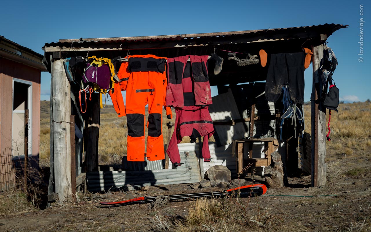 Los botes ya están a salvo del viento y los trajes secos ya están colgados. El poco apuro que teníamos para llegar hasta acá es historia y solo resta disfrutar de lo que queda del sol entrando por las ventanas del galpón. La luz se vuelve perfecta para las fotos y la simetría de las vigas de madera contrastando con la chapa le da el toque que le faltaba a una imagen de por sí diferente: tres botes amarillos descansando en el medio de la Patagonia en un viejo galpón de esquila abandonado.