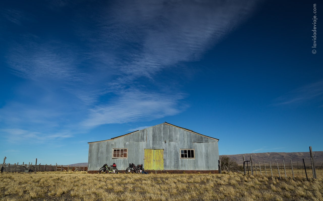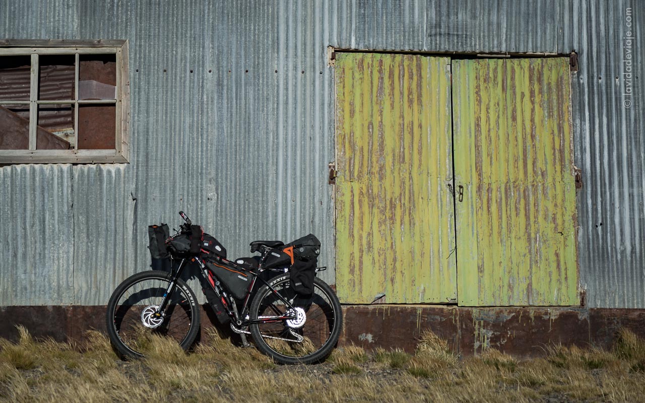 Ponemos las ruedas en su lugar y ahora sí las bicicletas vuelven a ser bicicletas, pero aunque estén listas para andar van a tener que esperar. Ya son cerca de las 6 y no nos queda mucho margen para avanzar. Este viejo galpón de esquila en el medio de la estepa es la única y mejor opción para armar la carpa. Mañana y con mucho viento a favor vamos a tener tiempo para pedalear.