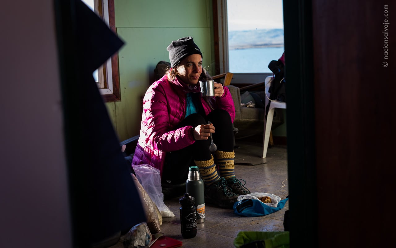 Afuera todo es calma. Adentro solo se escucha el fuego del calentador poniendo a punto el agua para el desayuno. Saco de mi mochila un poco de torta de manzana que traigo desde El Chaltén. El polvo marrón se transforma en café y el azúcar de la torta en calorías que activan nuestro cerebro aún dormido. Somos tres pero hay dos tazas. Yo tengo la mía y los chicos comparten una. En cuestiones de aprovechar espacios y optimizar pesos hay miles de consejos y este puede ser uno. Polémico y cuestionable para quien les habla porque para mí un buen café calentito entre las manos es casi religioso por las mañanas, pero bueno, cada viajero tiene sus propias mañas a la hora de preparar el equipo.