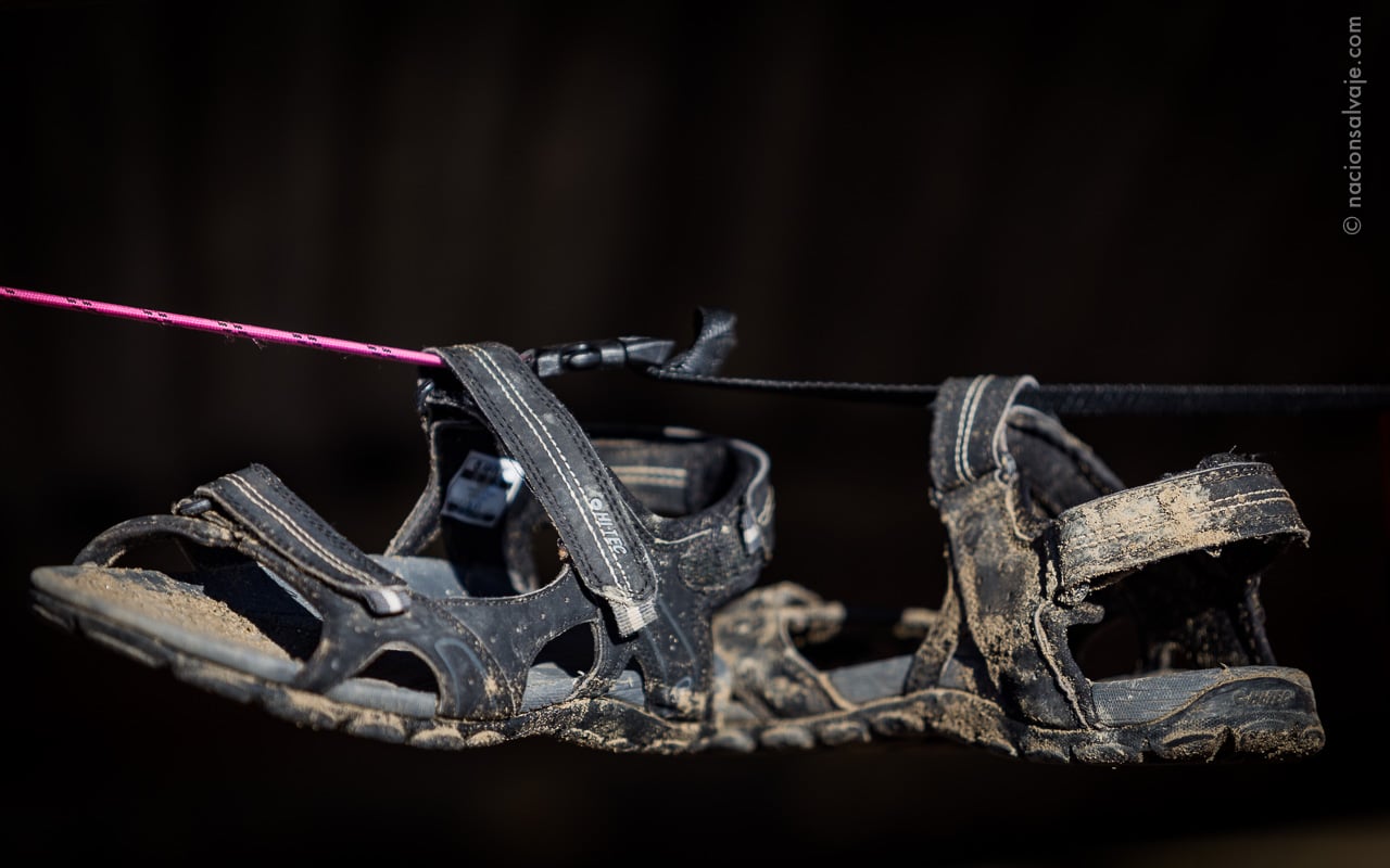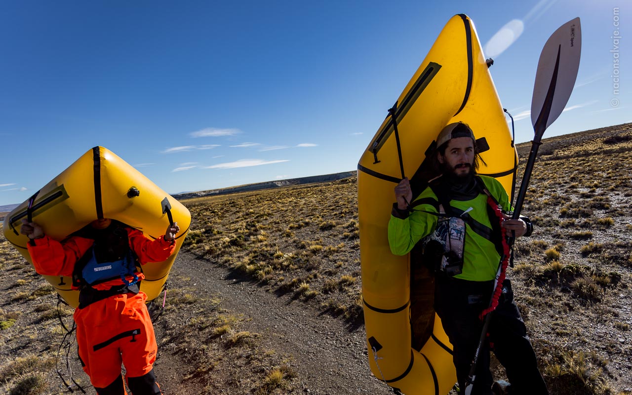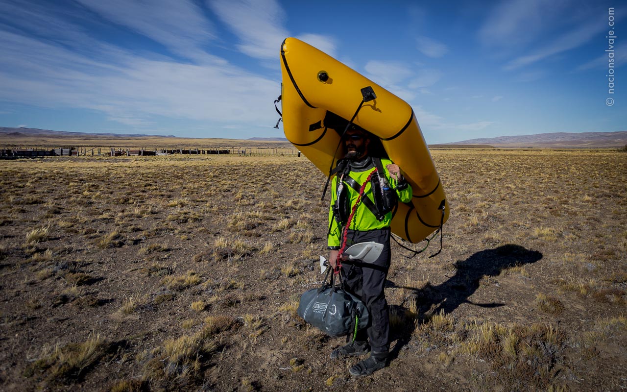 La distancia entre el río y el posible “hogar” de la noche es mucha y hay que aprovechar cada viaje. Cargamos el equipo como podemos, apoyamos el bote en la cabeza y mientras tanto jugamos a ser equilibristas con el viento.