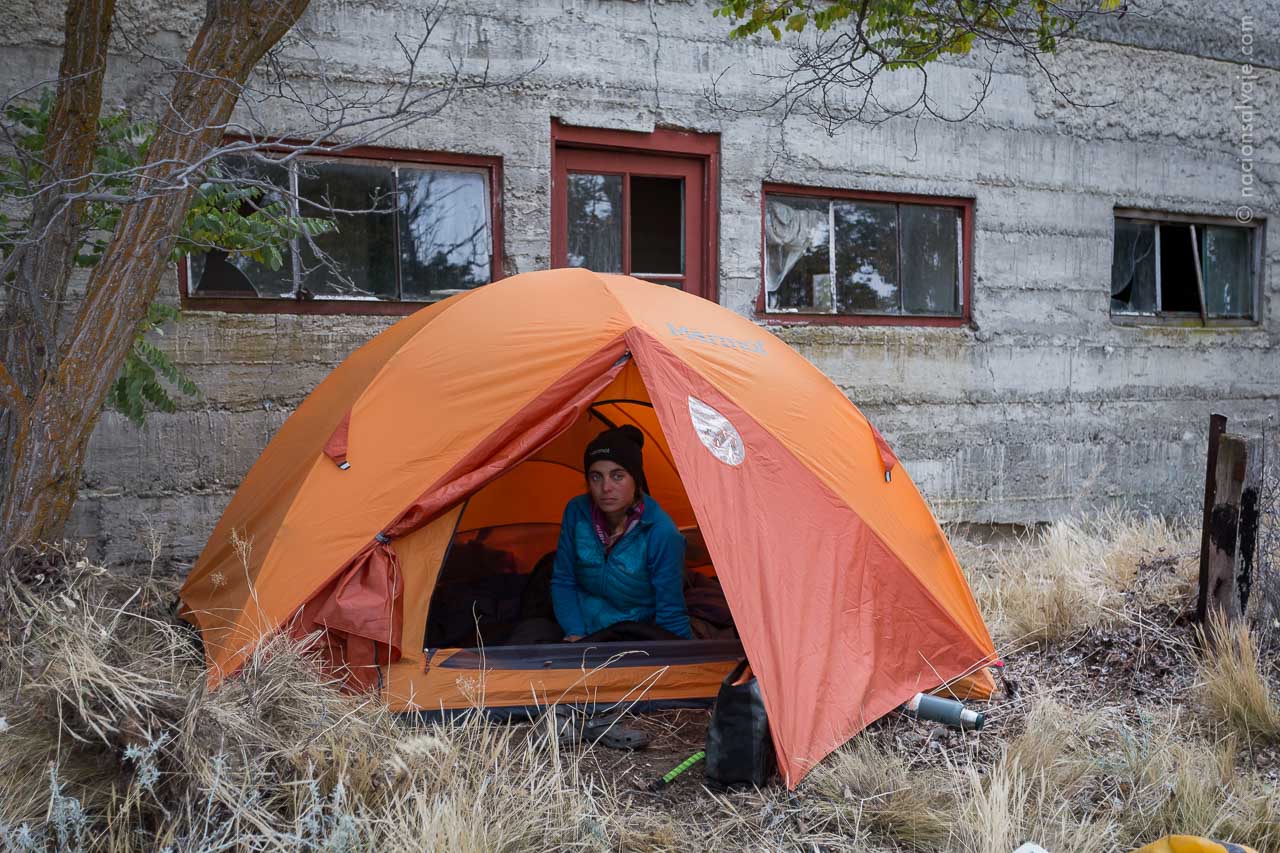 Mientras Javi juega a ser pescador en el río, con Sol armamos la carpa al reparo del puesto. La casita tiene tres puertas: una cerrada con candado que da a una cocina y otras dos que están abiertas. Por más tentador que sea dormir bajo techo y sin viento, no vamos a cometer otra vez el error de dormir entre ratones. Todavía es de día y no vemos ninguno, pero en cuanto se ponga el sol seguro van a salir a dar una vuelta.
